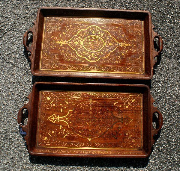 Two persian brass inlaid trays, signed.