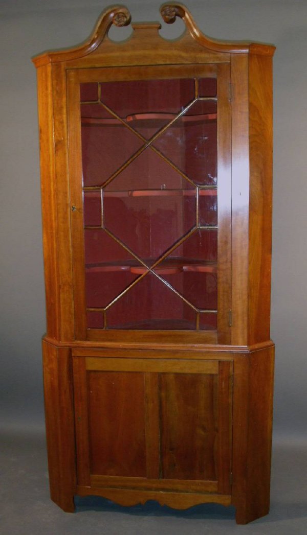 Two-piece cherry corner cupboard with broken arch