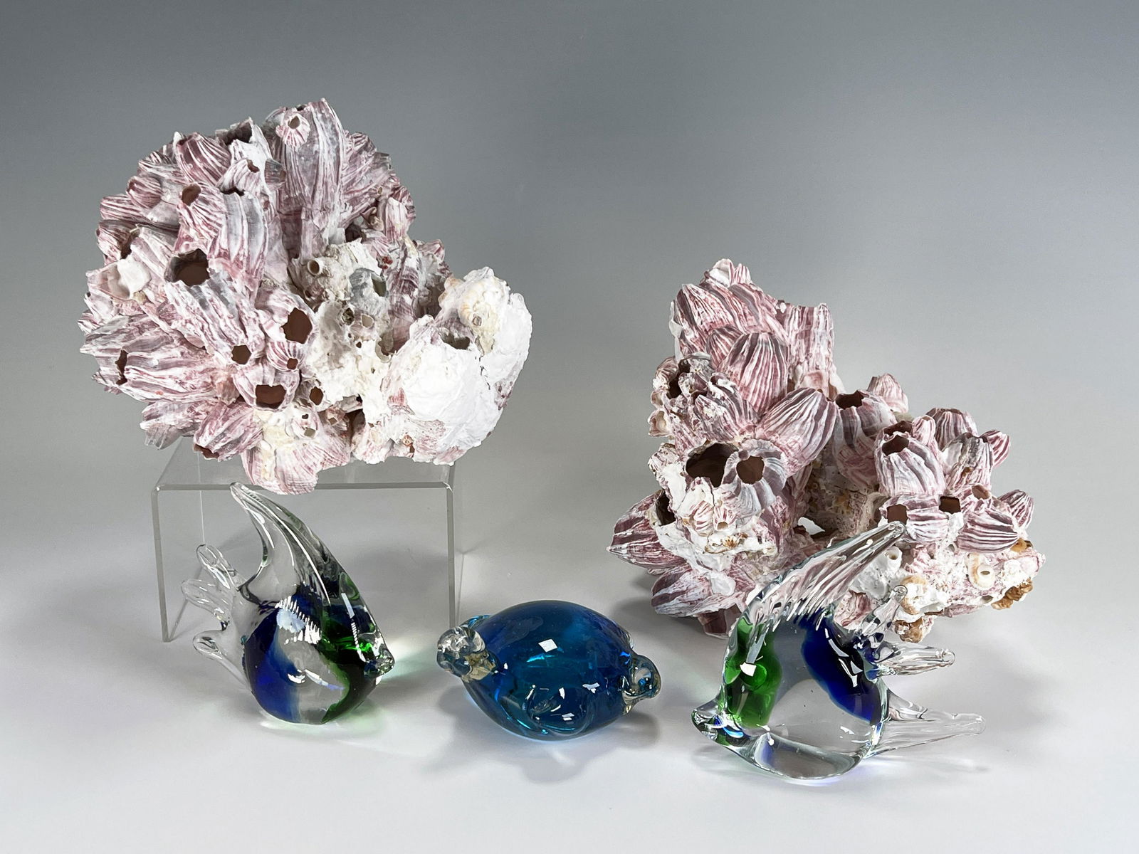 TWO PINK PLASTER BARNACLES TWO GLASS FISH & TURTLE
