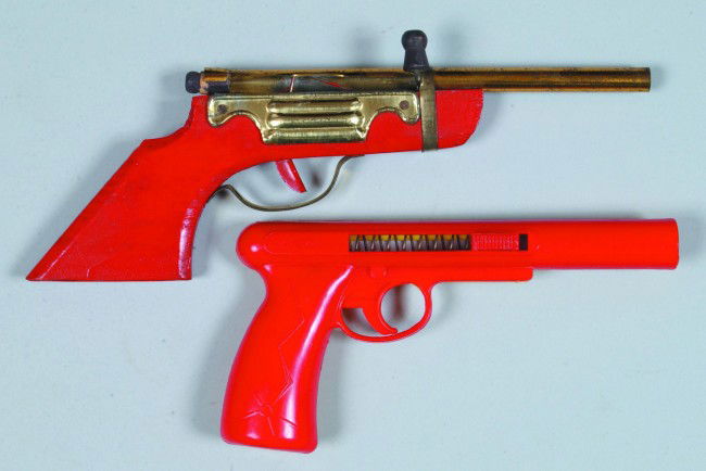 Two Pop Guns, one plastic, no markings, 7" long, c