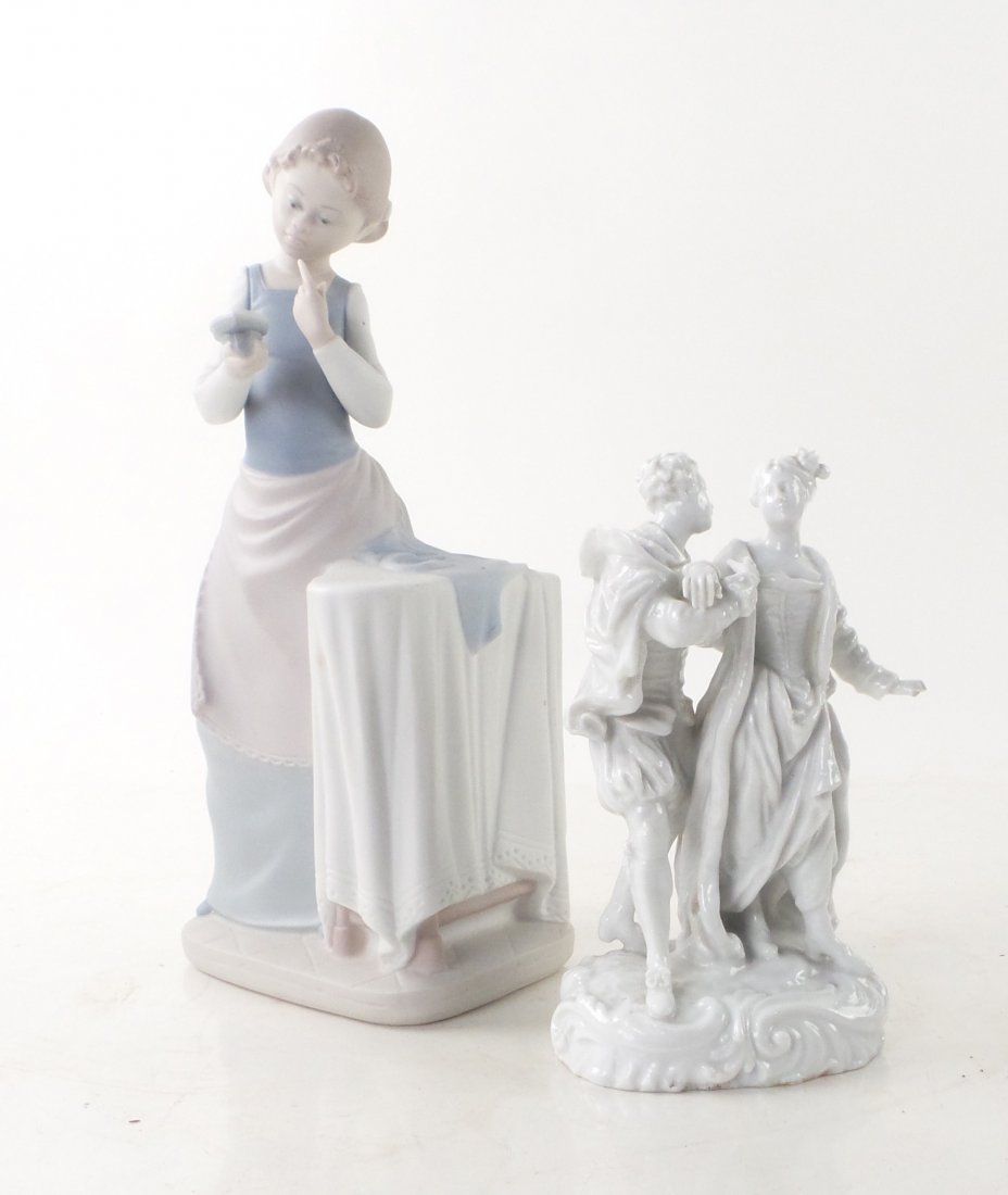 SoldTwo Porcelain Figural WorksComprising: 1.) Lladro figure of girl ironing. [10 1/4" H]. 2.) Capodimonte courting figurine. [6 1/4" H]. Both in good condition.See Sold Price