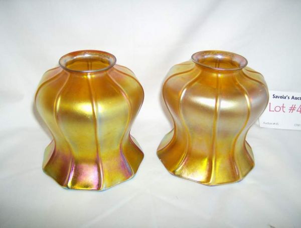 A SET OF IRIDESCENT GLASS SHADES. 14 cm x 9 cm. (3)