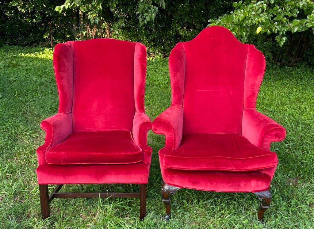 Two Red Upholstered Wingback Armchairs