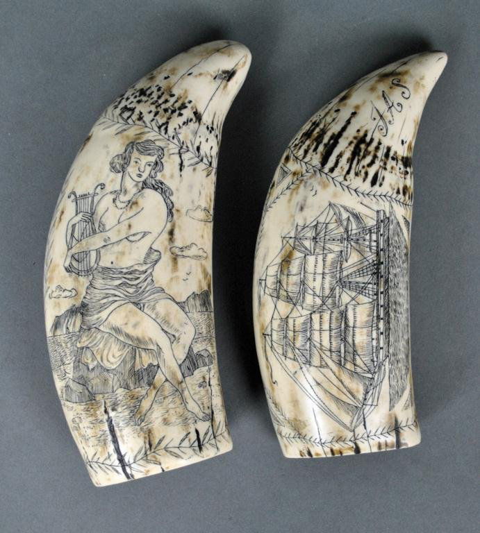 PAIR OF POLYCHROME SCRIMSHAW WHALE'S TEETH WITH LADY PORTRAITS 19th Century Lengths 5".Eldred's4.8(484)$7504 days Left