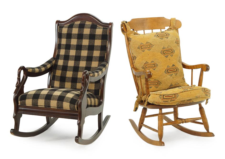 SoldTwo American Rocking ChairsTwo antique American rocking chairs, including a Shaker style and another. Provenance: From a Locust Valley Estate. [29 1/2" H x 19 1/2" W x 16 1/2" D (12" to seat); 39" H x 22 1/2" W x 27 1/2" D (14"See Sold Price