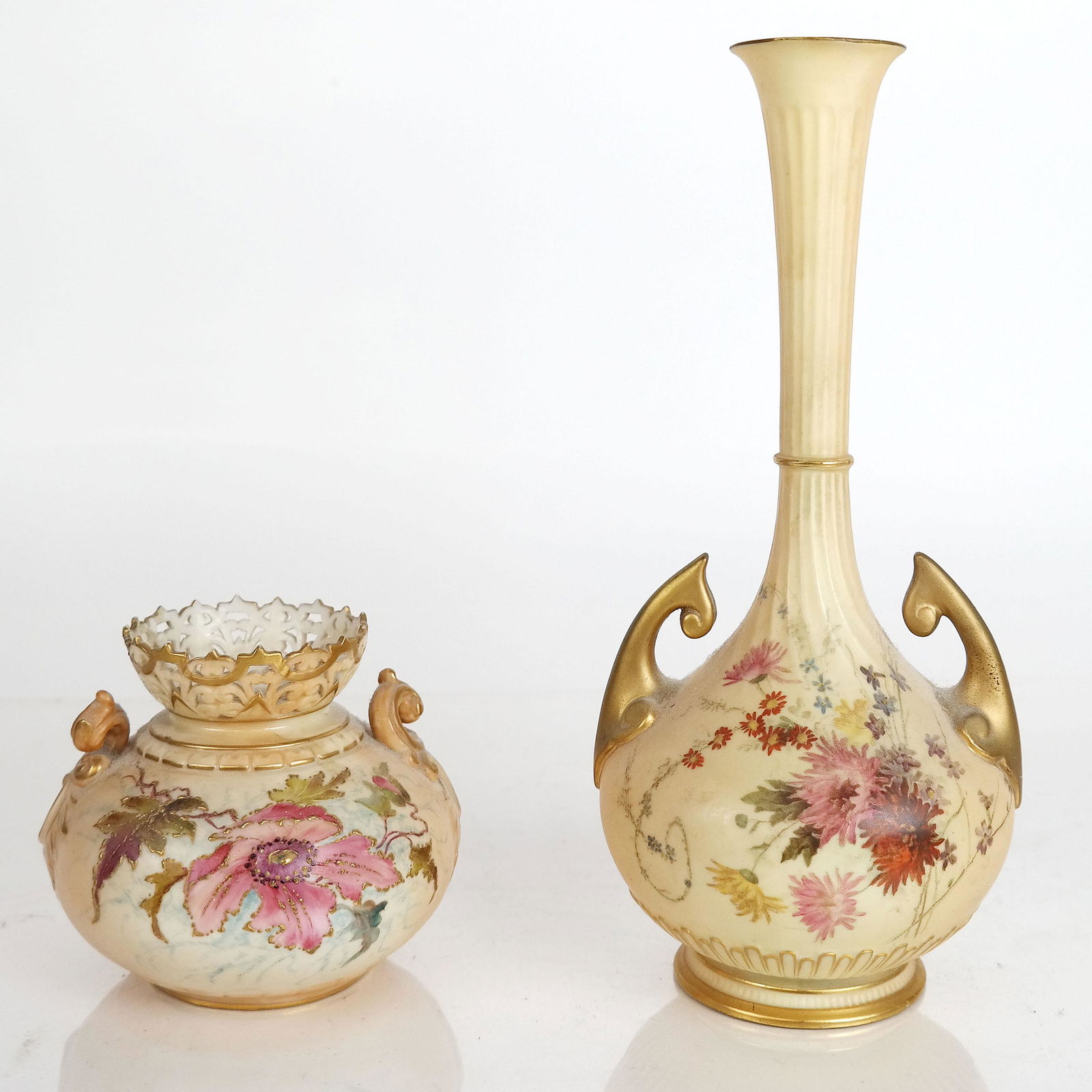 A ROYAL WORCESTER TWO-HANDLED VASE, BY THOMAS MORTON, of globular form with a flared neck and foliatA ROYAL WORCESTER TWO-HANDLED VASE, BY THOMAS MORTON, of globular form with a flared neck and foliate scroll handles, the body finely gilded with a swan amongst bullrushes, to an ivory ground, puce fa