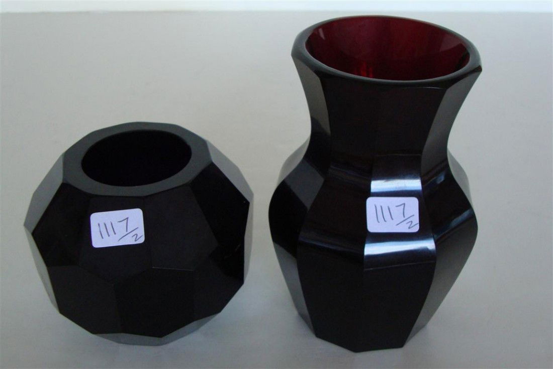 TWO RUBY GLASS BEVELED VASES