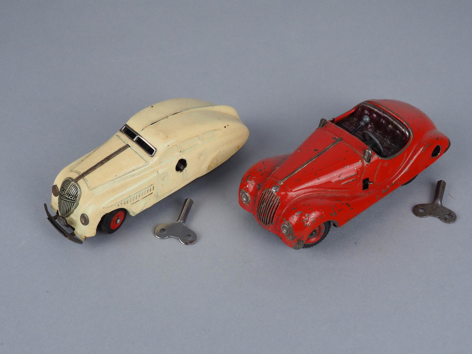 Sold2 SCHUCO GERMAN 1111 FEX TIN WIND UP CARSMade in US Zone Germany & Western Germany by Schuco. Two (2) 1950's tin windup 1111 Fex Dare Devil Car with roll over action & steerable front axle. Comes with 2 original keys. Measures 5.5" long.See Sold Price