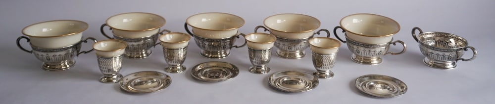 Lot of Shelley Bone China Regency Pattern PiecesMar 26, 2026STERLING SILVER lot to include pair weighted bottom candlesticks, (2) weighted bottom bud vases &Apr 10, 2026Mexican Sterling Silver Lot, incl; Sauce/Gravy Dish, Liner & Ladle (4"h x 7"w), 2 Sterling Cordials1 hr LeftCHRISTOFLE GALLIA SILVER PLATE MIXED LOT VINTAGE HOLLOWWAREMar 21, 2026Silverplate and Sterling SilverMar 20, 2026Four Silver-Plate Table ArticlesSet of (12) Pieces of Bone ChinaJul 17, 2025STERLING SILVER (6) LENOX china soup bowls with sterling sleeves, nice overall condition, has (10)Apr 10, 20266 Gorham Sterling Silver Reticulated Salts AND 6 Sterling Silver Demitasse Cordials with Porcelain1 hr LeftFour Antique Silver Pieces incl SterlingMar 20, 2026Sterling Silver 6 piece Demitasse Cups and SaucersMar 19, 2026Six-piece Gorham 'Medallion' Silverplate Coffee and Tea Service and Six Coin Silver Tablespoons,William Adams, Etc. Silver Plate Tableware, 8 Pcs.2 days LeftReed & Barton, Etc. Silver Plate Tableware, 10 Pcs2 days LeftSTERLING: Gorham, etc., six pieces, details include: pair of Gorham demitasse cup holder and6 days LeftGorham Silverplate Tea and Coffee Service in Medallion PatternMar 20, 2026