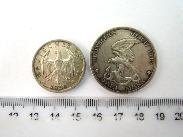 Two silver coins, German Reich, three Mark, 1913