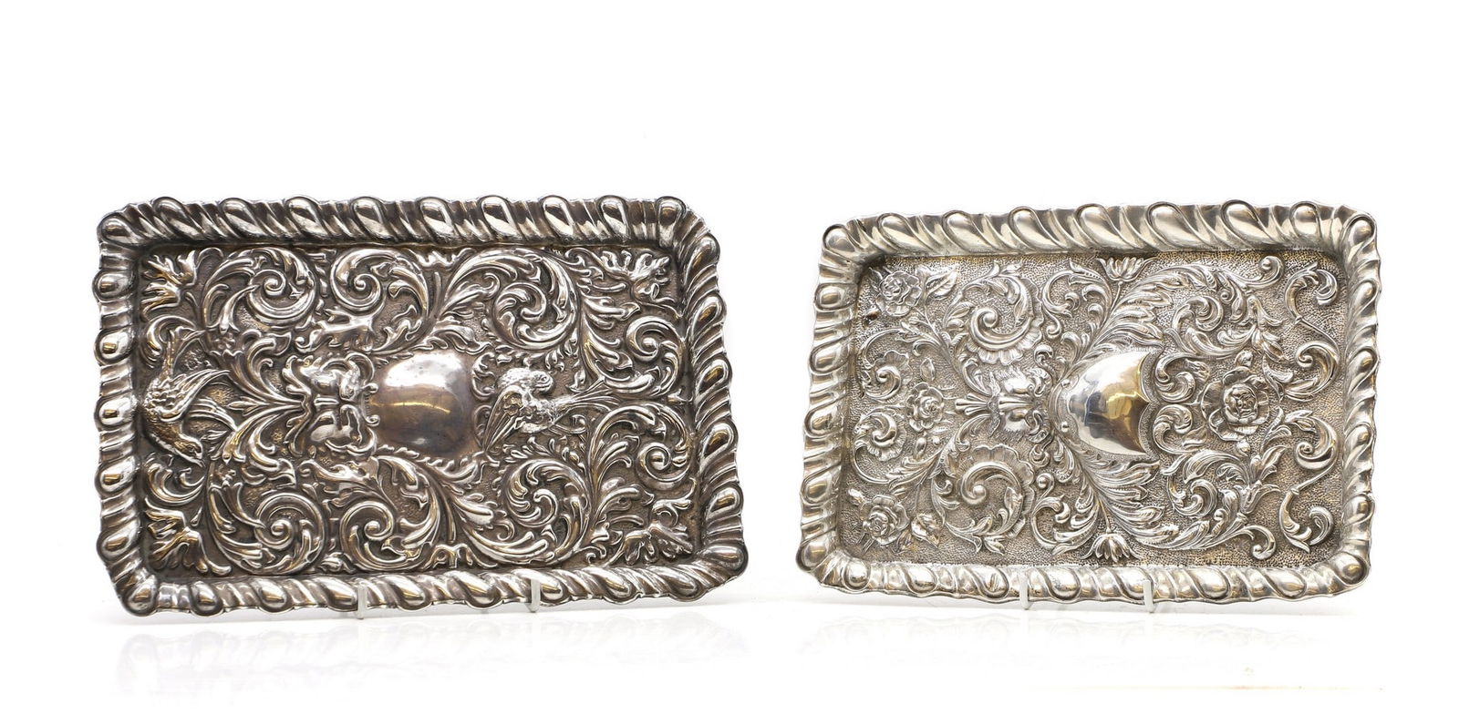 Two silver embossed dressing table trays,