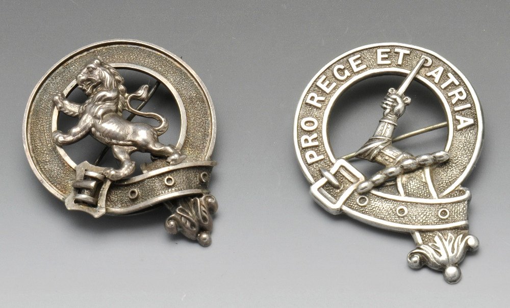 Two silver military cap badges.