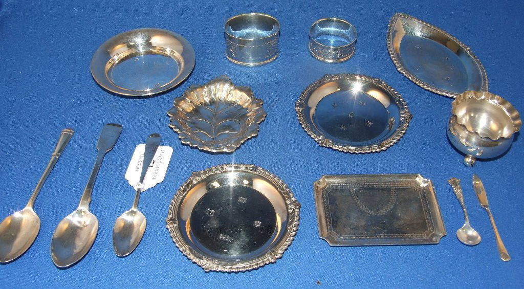 Two silver napkin rings, and other silver items,