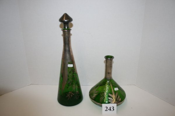 Two silver overlay green glass bottles