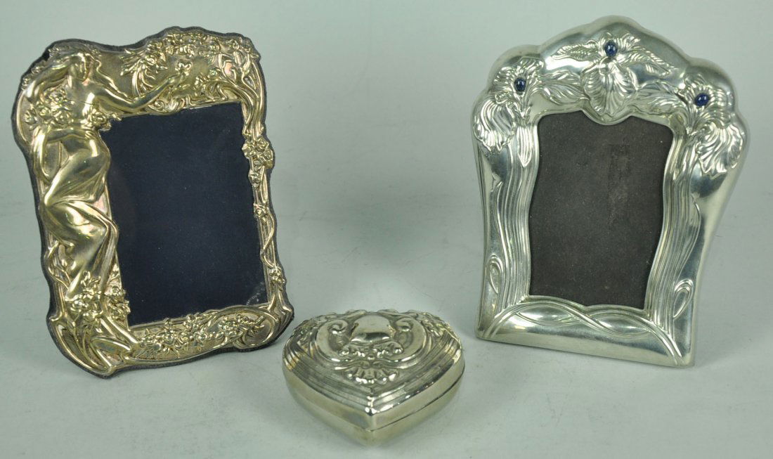 SoldThree Sterling Photo FramesThree Sterling Silver Photo Frames, two round with English Hallmarks for Birmingham 5.5" & 6" (with monogram) and one in Art Nouveau style with heart shaped opening hallmarked for London 1970 5.5" x 7See Sold Price