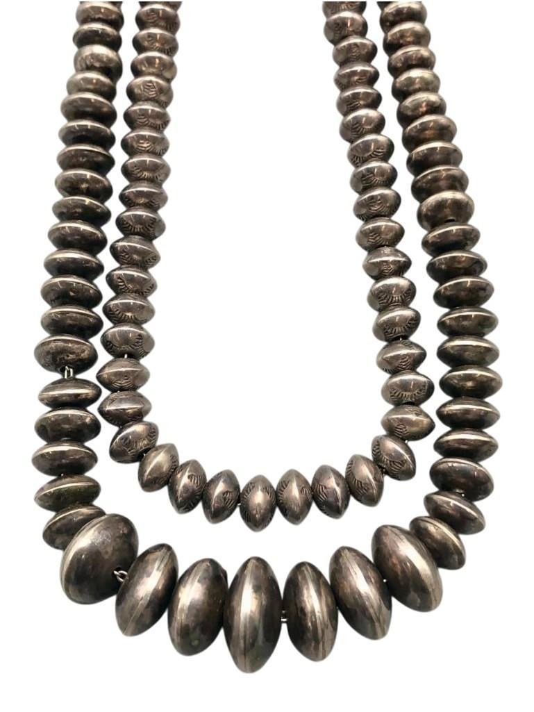 SoldTwo Sterling Silver Bead NecklacesAvailable here for your consideration are two sterling silver bead necklaces. These stellar necklaces feature stamped round and elongated silver beads in a variety of sizes, with tiny silver beads asSee Sold Price