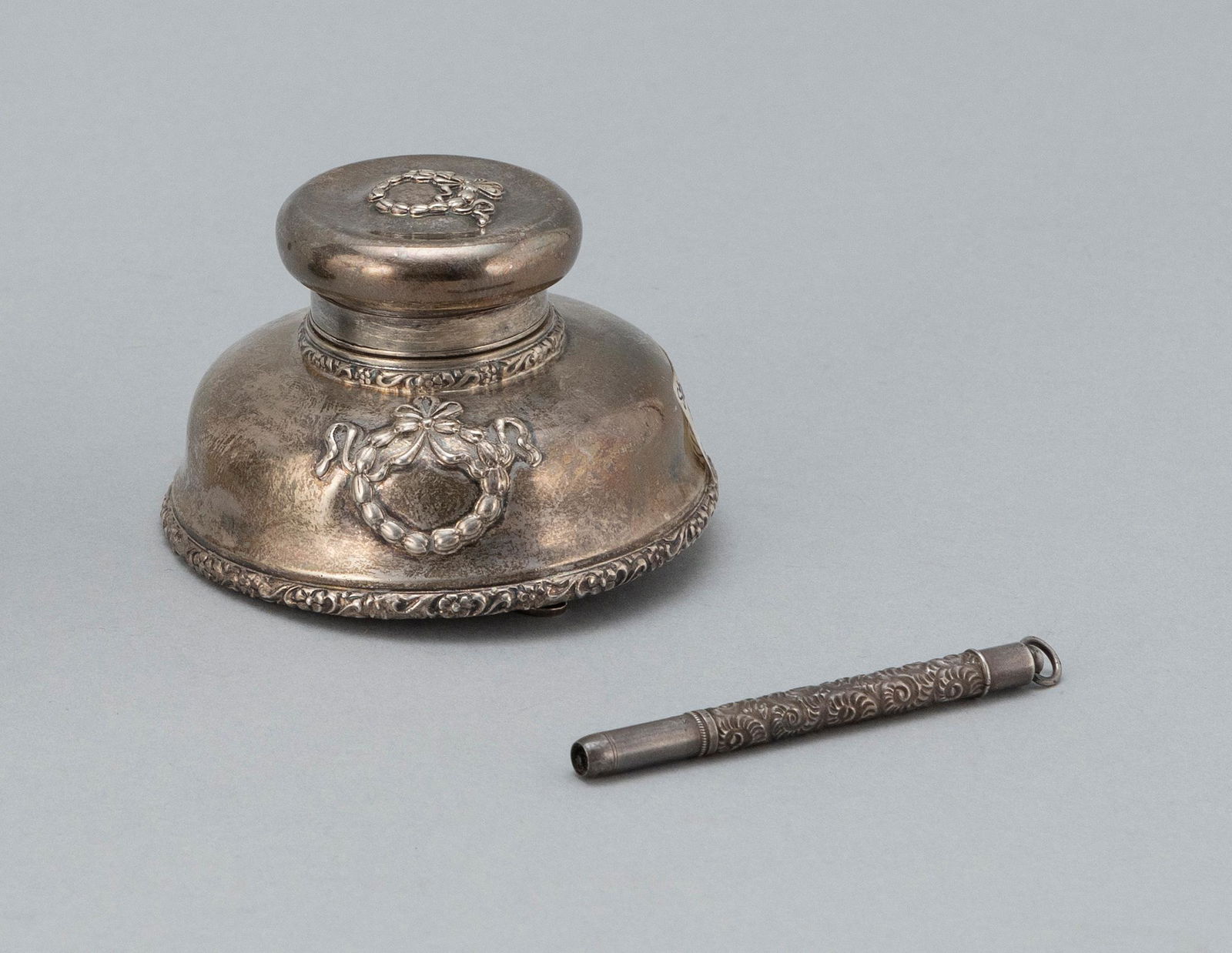 TWO STERLING SILVER WRITING OBJECTS A travel inkwell
