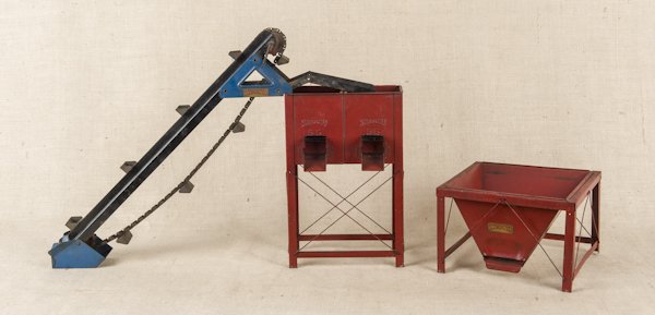Two Structo pressed steel sand bins and a loader,