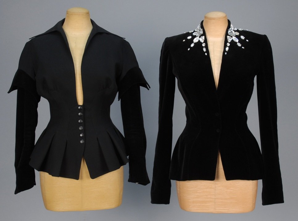SoldTHIERRY MUGLER WOOL JACKET and SKIRT SUITBoth black: zip-front jacket with zippered pockets having decorative pulls, peplum back with storm flap, B-38, Sh-20, Slv-23, W-32, L-27; skirt suit having curved lapel with cutout, faux pockets and dSee Sold Price
