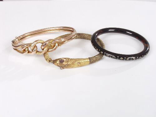 Sold2 Yellow Gold Bangle BraceletsTwo Yellow Gold Hinged Bangle Bracelets. Including one English Victorian 9 ct rose gold stamped "9.375" with buckle motif and one 14 kt with double bamboo motif with brushed finish. No damage apparentSee Sold Price