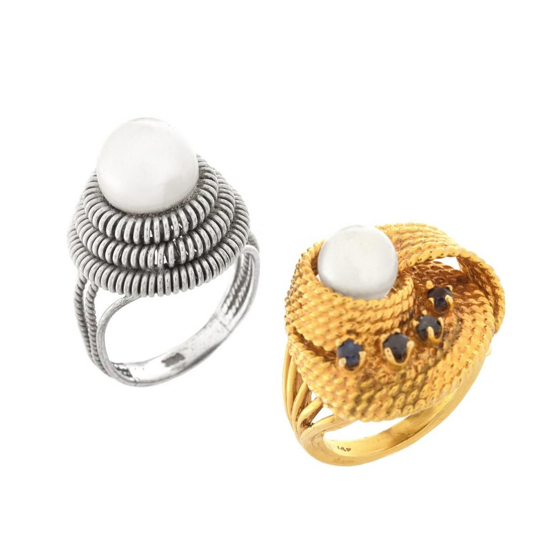 SoldTwo Vintage Pearl RingsTwo Vintage Pearl Rings Including a 14 Karat Yellow Gold, 7.5mm Pearl and Small Sapphire Ring and a 10 Karat White Gold and 10mm Pearl Ring. Stamped 14K and 10K. Ring sizes 5, 7-1/2. Approx. weight: 1See Sold Price
