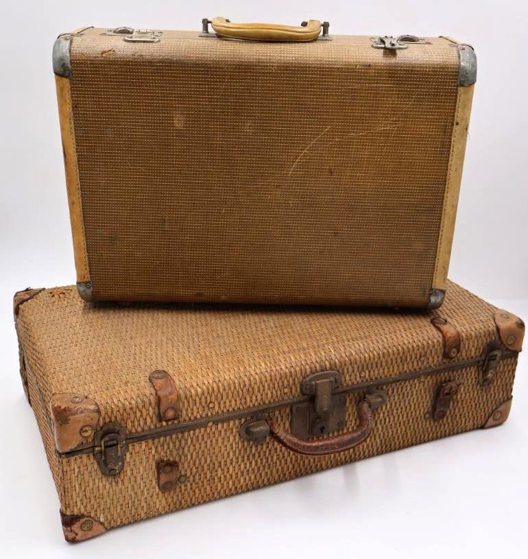 Two Vintage Suitcases, One Woven Wicker