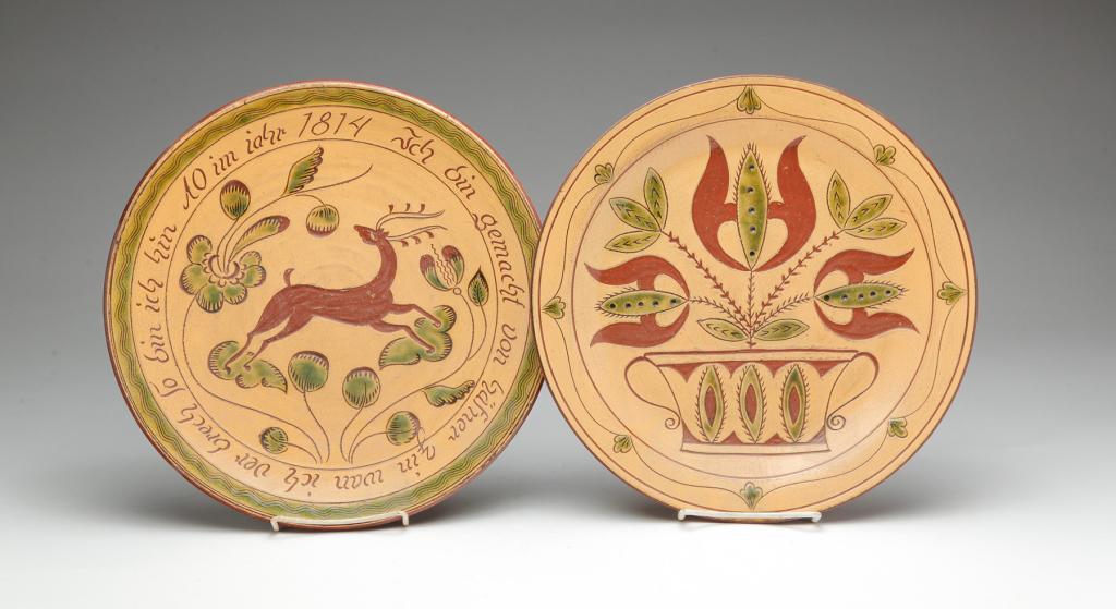 TWO WISCONSIN POTTERY DECORATED PLATES.