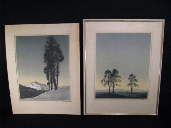 TWO WOOD BLOCK TYPE LANDSCAPES ON SILK SIGNED