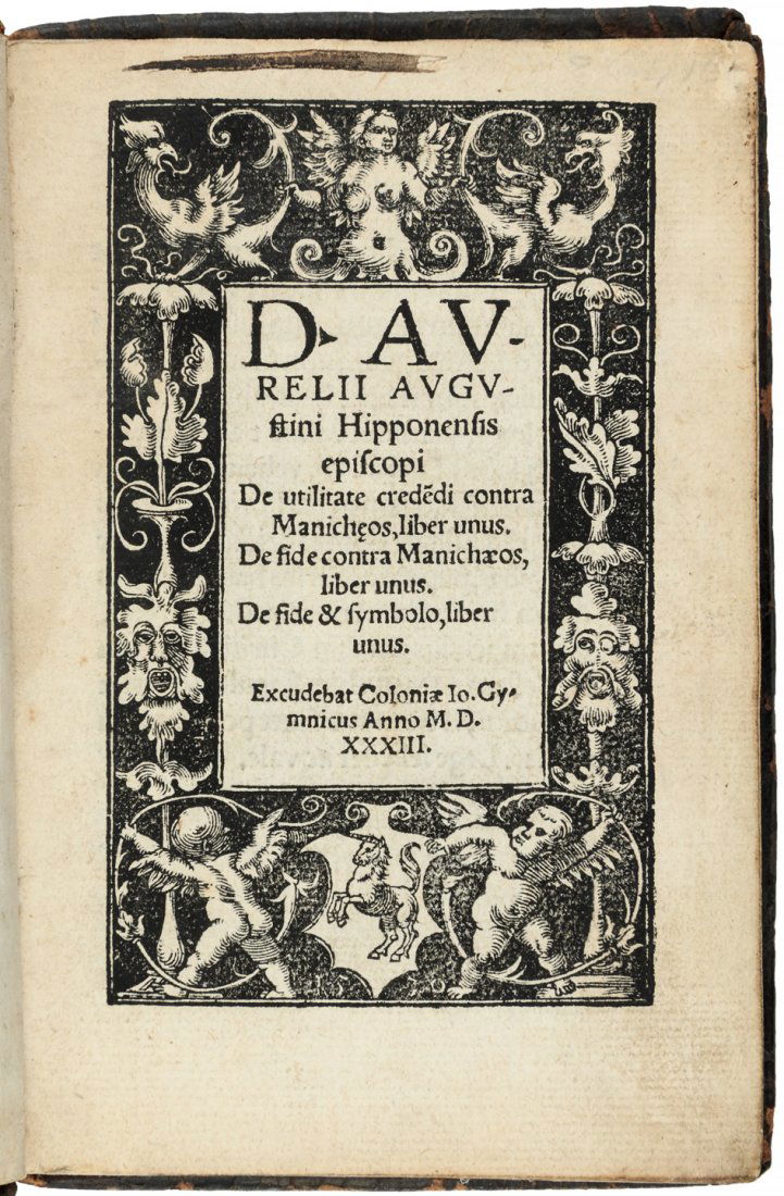 Sold1584 1st Thus Saint Augustine Works1584 1st Thus Saint Augustine Works [bible] Big: 650+ Col. (fine) White Vellum: 1st Thus. V. Scarce. Pub.: Venice: 1584. Men go abroad to wonder at the heights of mountains, at the huge waves ofSee Sold Price