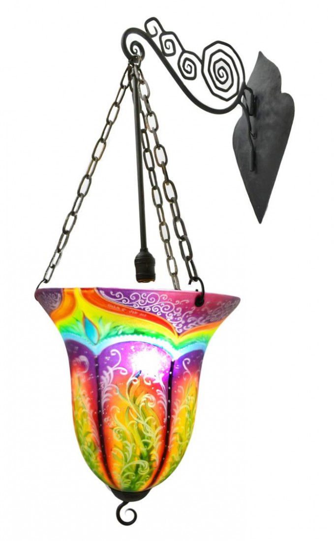 SoldUlla Darni Reverse Painted Glass & Iron ChandelierDESCRIPTION: Ulla Darni hand painted reverse glass shade and forged iron chandelier, features multicolored floral painted decorations throughout, signed "Ulla" at shade and at canopy. CIRCA: 20th CentSee Sold Price
