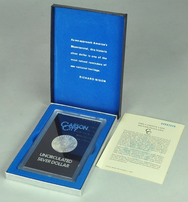 SoldUncirculated 1884 Carson City GSA Morgan silver dollarUncirculated 1884 Carson City GSA Morgan silver dollar. Original box and certificate. Please see photos. For in house shipping. Please call Mike at Thriftiques 319-321-0613See Sold Price