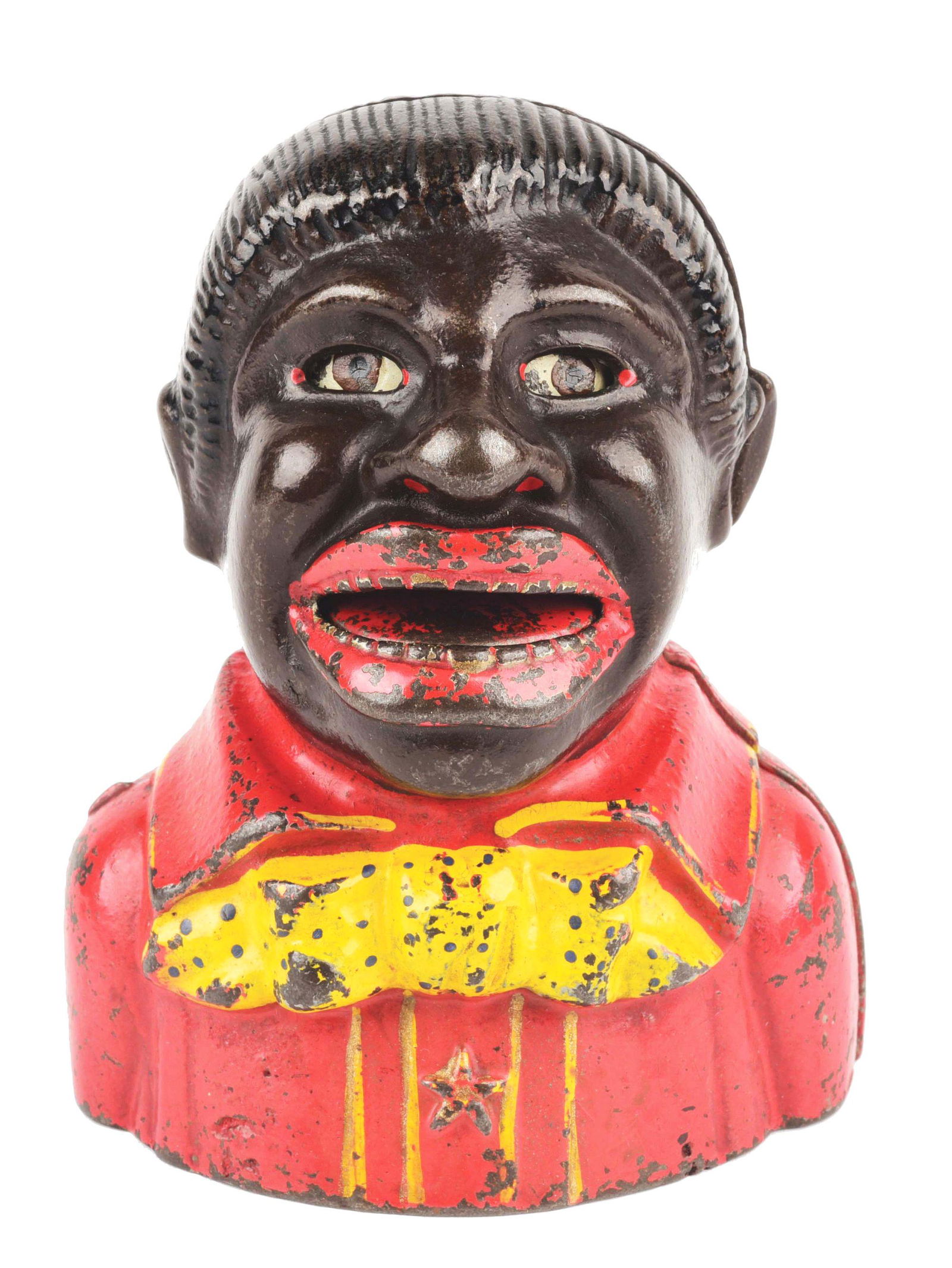 SoldUNCLE TOM WITH STAR MECHANICAL BANKKyser & Rex Co., Philadelphia 1882, red jacket and blue bow version, embossed "Uncle Tom" on lapels, placing coin in mouth and pressing lever, then releasing allows eyes to roll and coin to be depositSee Sold Price