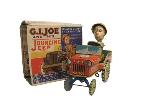 SoldUnique Art Tin Windup G.I. Joe & His Jouncing JeepUnique Art tin litho windup G.I. Joe and his Jouncing Jeep. Displays nicely with good color and graphics. The Jeep has some small scratches and wear from storage and display. Windup mechanism works. MSee Sold Price