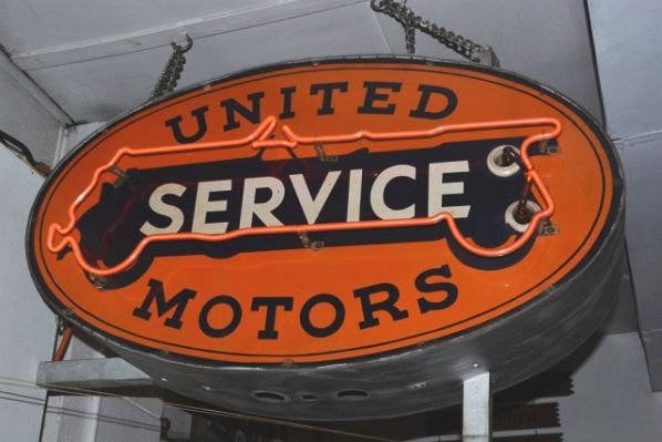 Sold36" United Motors Service SS Porcelain Neon Sign TAC 836" United Motors Service Single Sided Porcelain (SSP) Oval Neon Sign. Mounted on the original can with new neon tubing. One chip in the left-hand field. The colors are weathered or slightly oxidate.See Sold Price