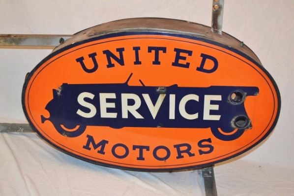 SoldUnited Motors Service DS Porcelain Sign TAC 9.5United Motors Service Double Sided Porcelain Sign TAC 9.5. DSP (double sided porcelain) oval sign has excellent color and gloss w/ clean fields on each side. Display side has tiny chip along outer edgSee Sold Price