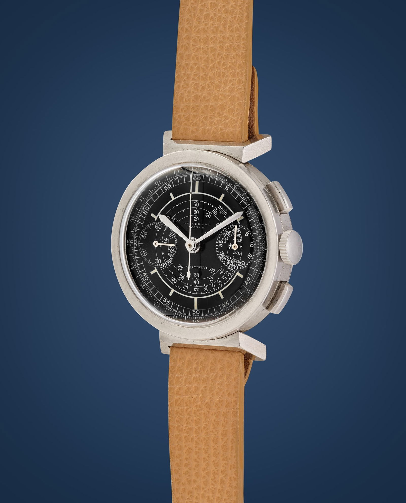 SoldA RARE GENTLEMAN'S LARGE SIZE STAINLESS STEEL UNIVERSAL GENEVE AERO COMPAX CHRONOGRAPH WRIST WATCHA RARE GENTLEMAN'S LARGE SIZE STAINLESS STEEL UNIVERSAL GENEVE AERO COMPAX CHRONOGRAPH WRIST WATCH CIRCA 1960s, REF. 22703/3Movement: 17J, manual wind, cal. 130, signed Universal Geneve. Case: DiameteSee Sold Price