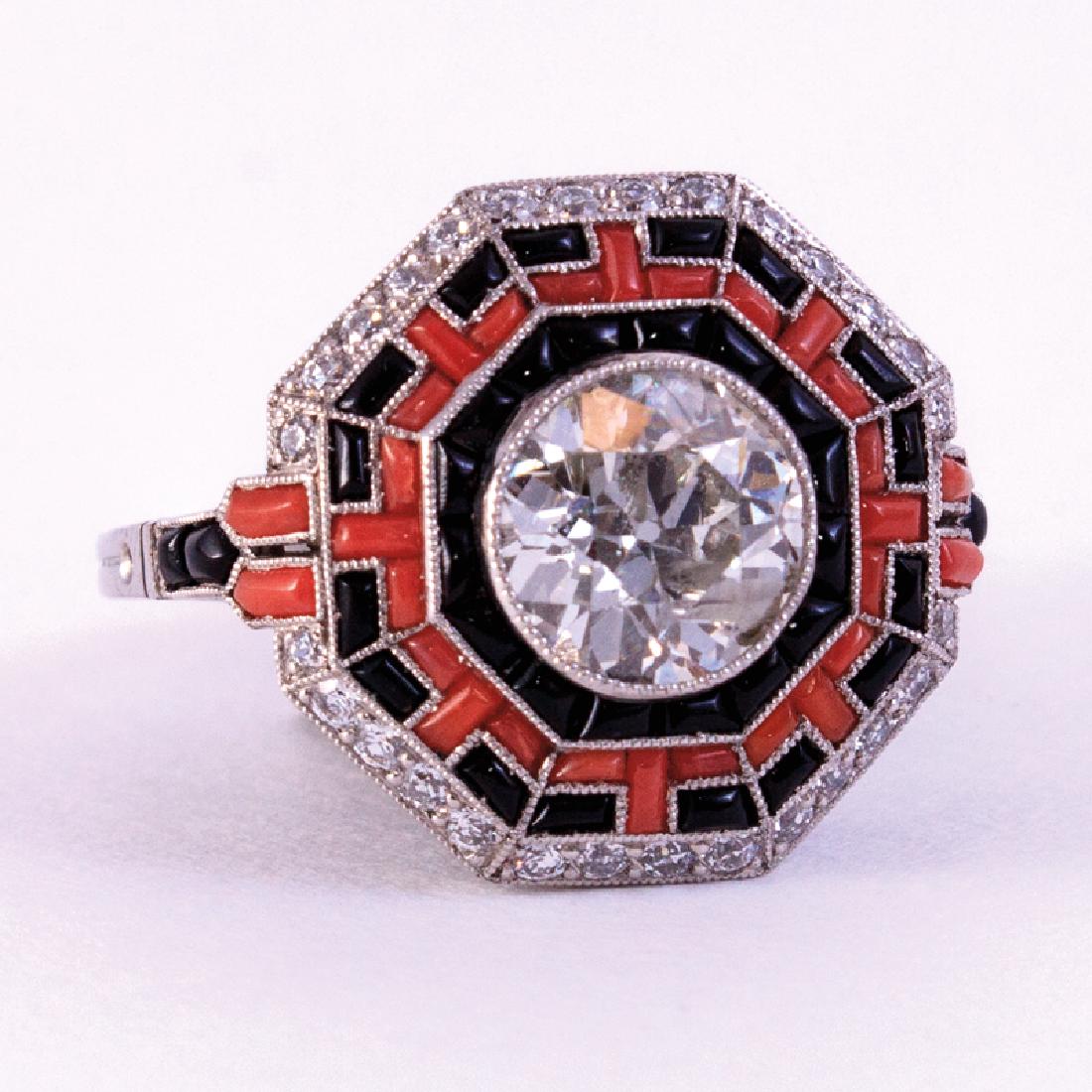 SoldPlatinum Diamond Coral Onyx RingMETAL: Platinum. MEASUREMENTS: Ring size - 7.5, ring top - 18mm in diameter. GEMSTONES: Onyx, Coral, Diamonds approx. 0.95ctw. TESTED: Plat. WEIGHT: 6 grams.Gemstones have not been graded for color anSee Sold Price