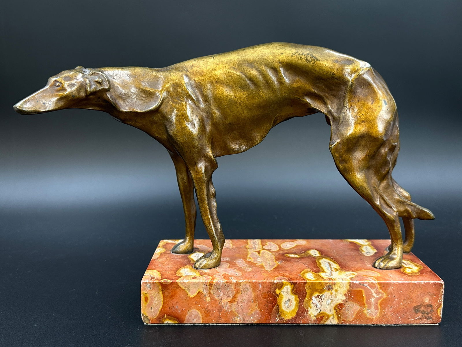 UNSIGNED (XX). Bronze figure. Greyhound on a marble base.