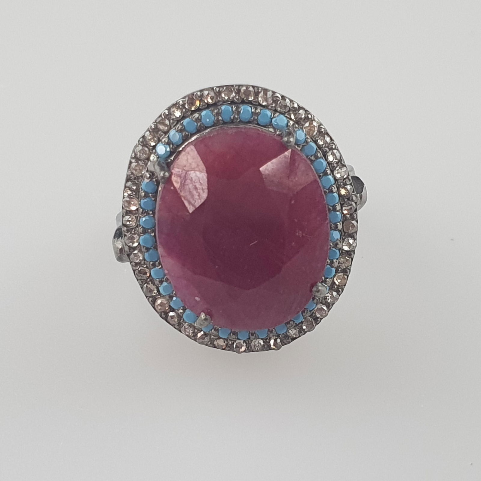 Unusual 925 Silver Ring Ruby, Turquoise, Rose cut
