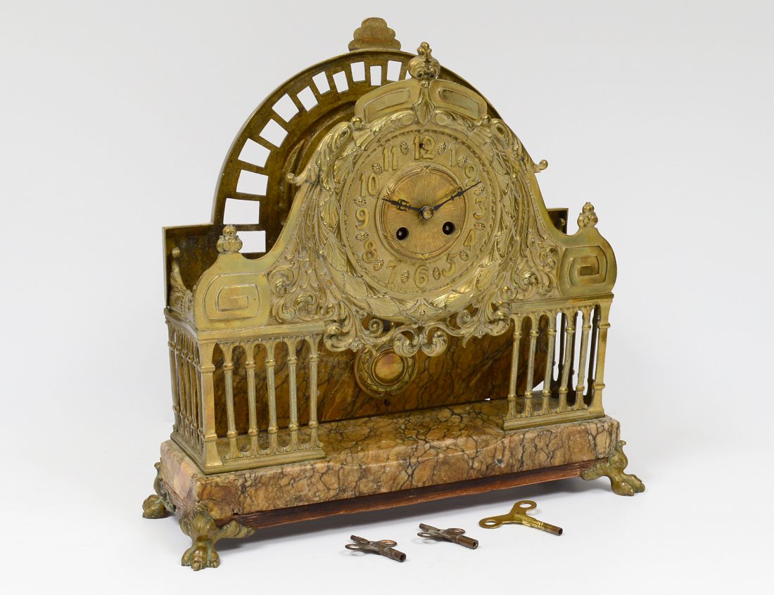 UNUSUAL BRASS AND MARBLE MANTEL CLOCK