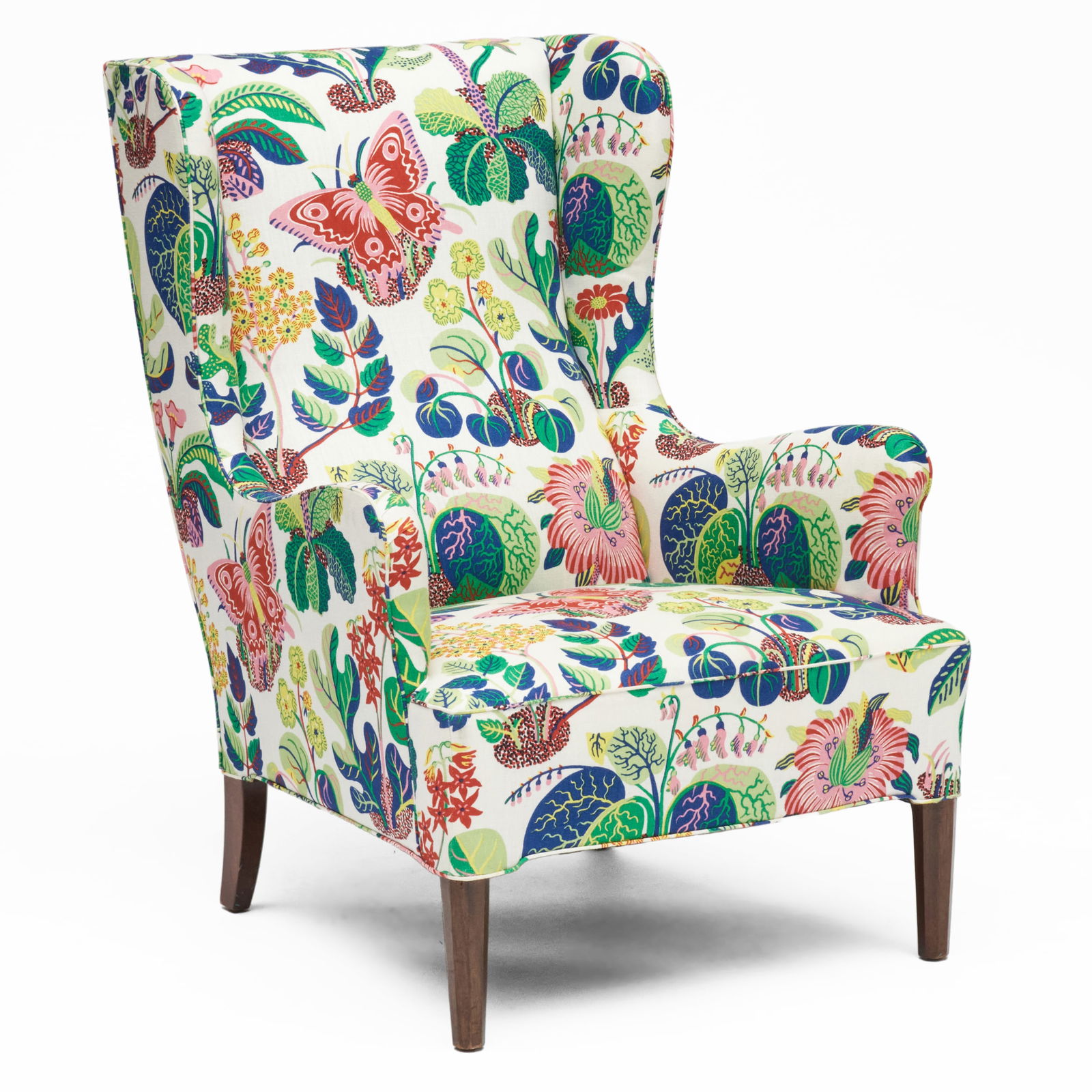SoldMACKENZIE-CHILDS UPHOLSTERED WING CHAIRwith manufacturer's label; removable cushion, porcelain knobs and wood painted legs 34 inches wide; 34 inches deep; 42 inches high; seat height:19 inchesSee Sold Price