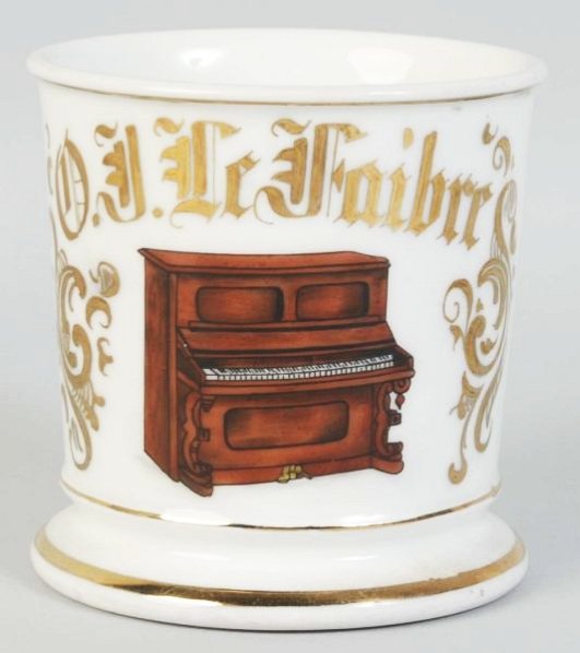 SoldPIANO PLAYER'S SHAVING MUGIt has the name "C. Seger" in gold gilt. The mug has a hairline inside the bottom of the base, and a nice detail of a piano. Condition: (Excellent) Dimensions: 4 - 1/2" x 3 - 1/2" x 3 - 1/2".See Sold Price