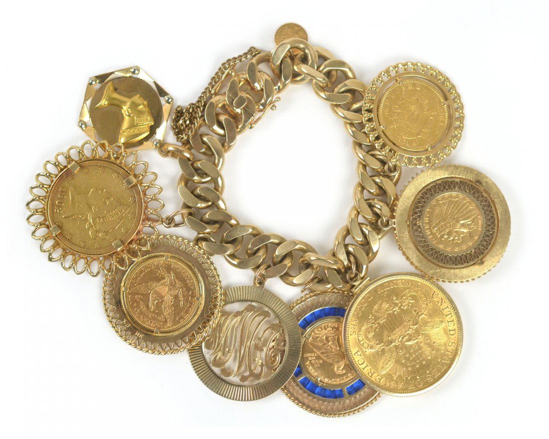 14K gold charm bracelet with 14 charms, including a 1907 US liberty head $5 gold coin (drilled),Tremont Auctions4.6(313)$750Mar 01, 2026