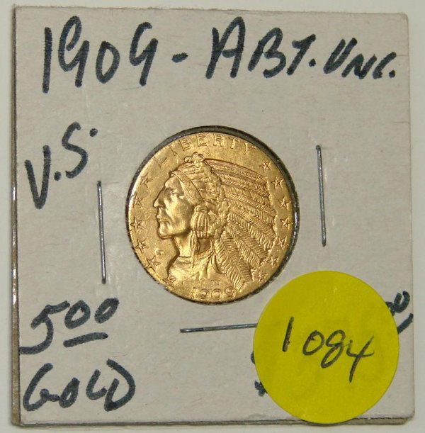 Sold1909 $ 5 Gold Indian Half Eagle BUItem is the exact item in image. Bidder is responsible for all grades and values. Any bid is full acceptance of this and all other terms when bidder registered for sale.See Sold Price