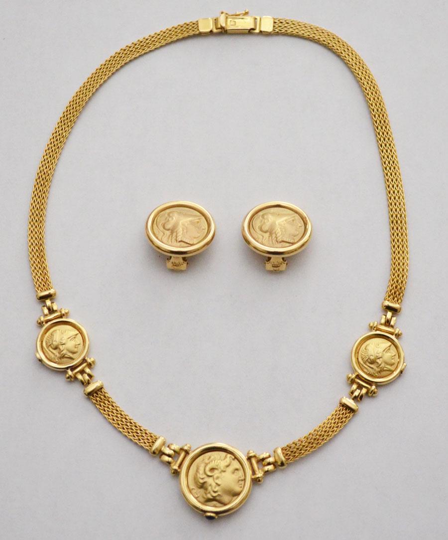 18k Gold Roman Greek Coin Necklace & Earrings