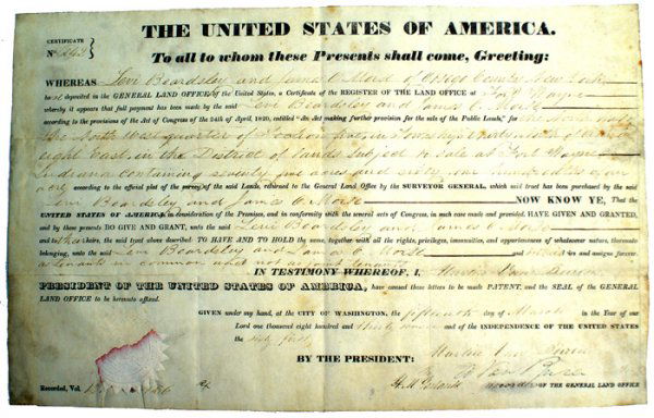 SoldMartin van Buren Signed 1840 Illinois Land GrantThis land grant signed twice by 8th U.S. President Martin van Buren is dated October 10, 1840 and is signed to John Saswell Sr. of Fulton County, Illinois. This parchment paper document marks the saleSee Sold Price