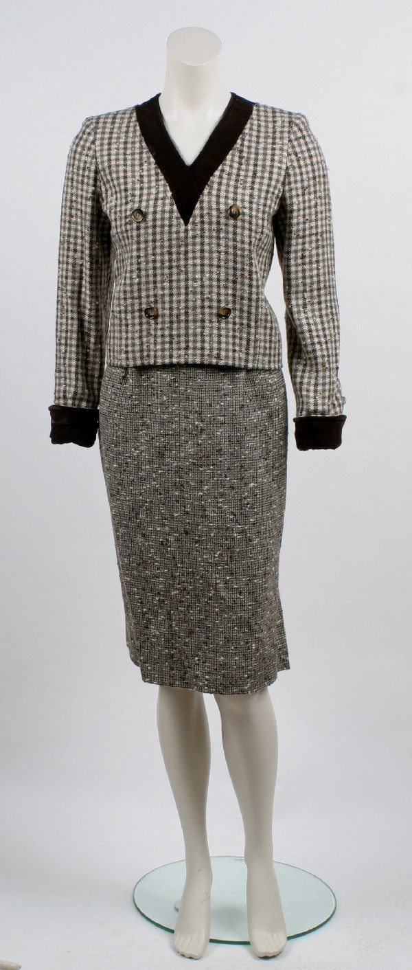 SoldTWO VALENTINO SKIRT SUITS, 1990-2000s2-pc ensemble c/o plaid silk taffeta blazer in black & cafe au lait w/ dupioni stripes, wool boucle skirt w/ silk organza kick pleat godet at CB, c. 1990, label “Valentino Boutique”, jacket BSee Sold Price