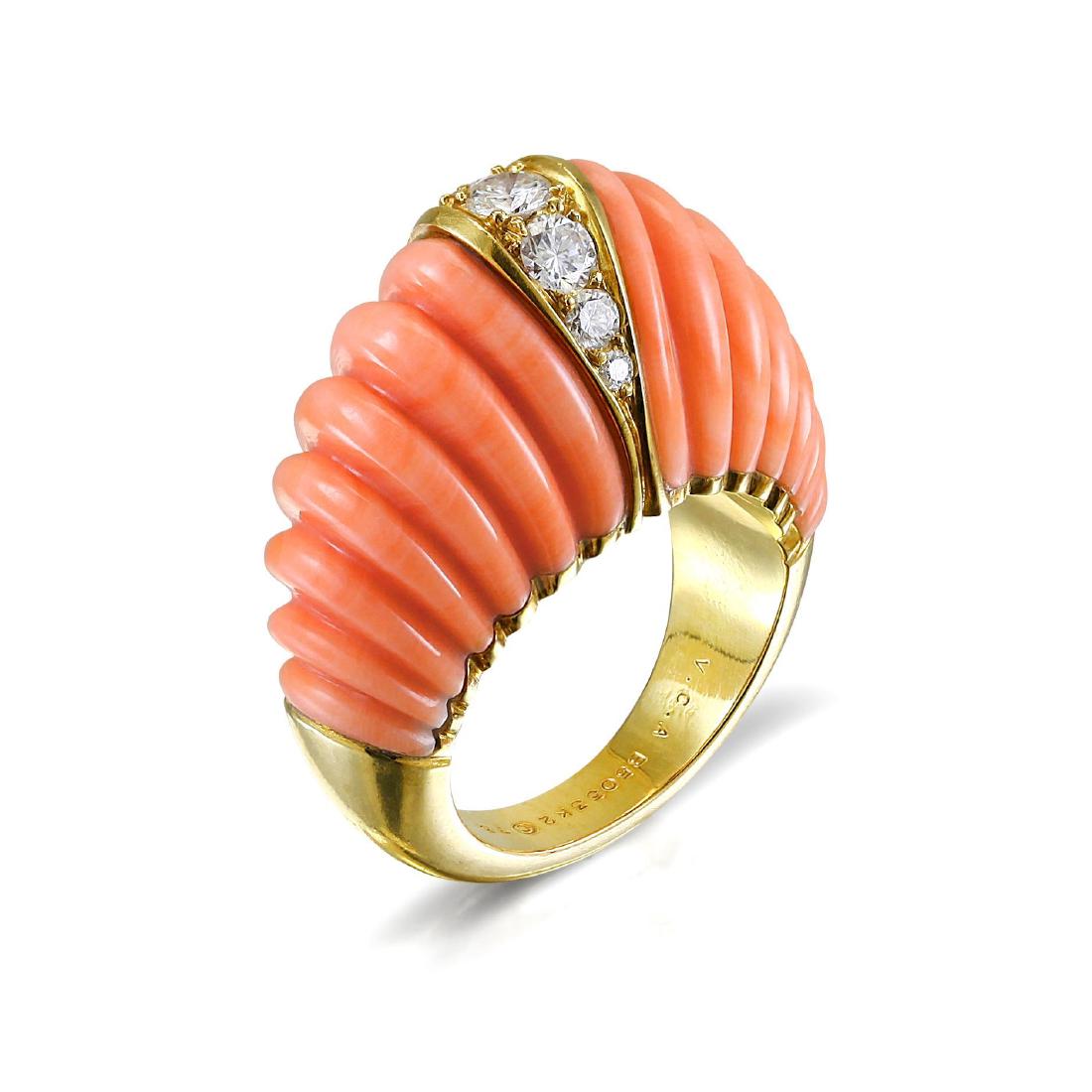 SoldVAN CLEEF & ARPELS, YELLOW GOLD, DIAMOND AND CORAL 'PHILIPPINE' RINGVAN CLEEF & ARPELS, YELLOW GOLD, DIAMOND AND CORAL 'PHILIPPINE' RING Round brilliant cut diamonds flanked by coral. Ring size 7. Stamp: VCA OR 7 68 B5001 K 141 (French assay mark) (maker's mark). GrosSee Sold Price
