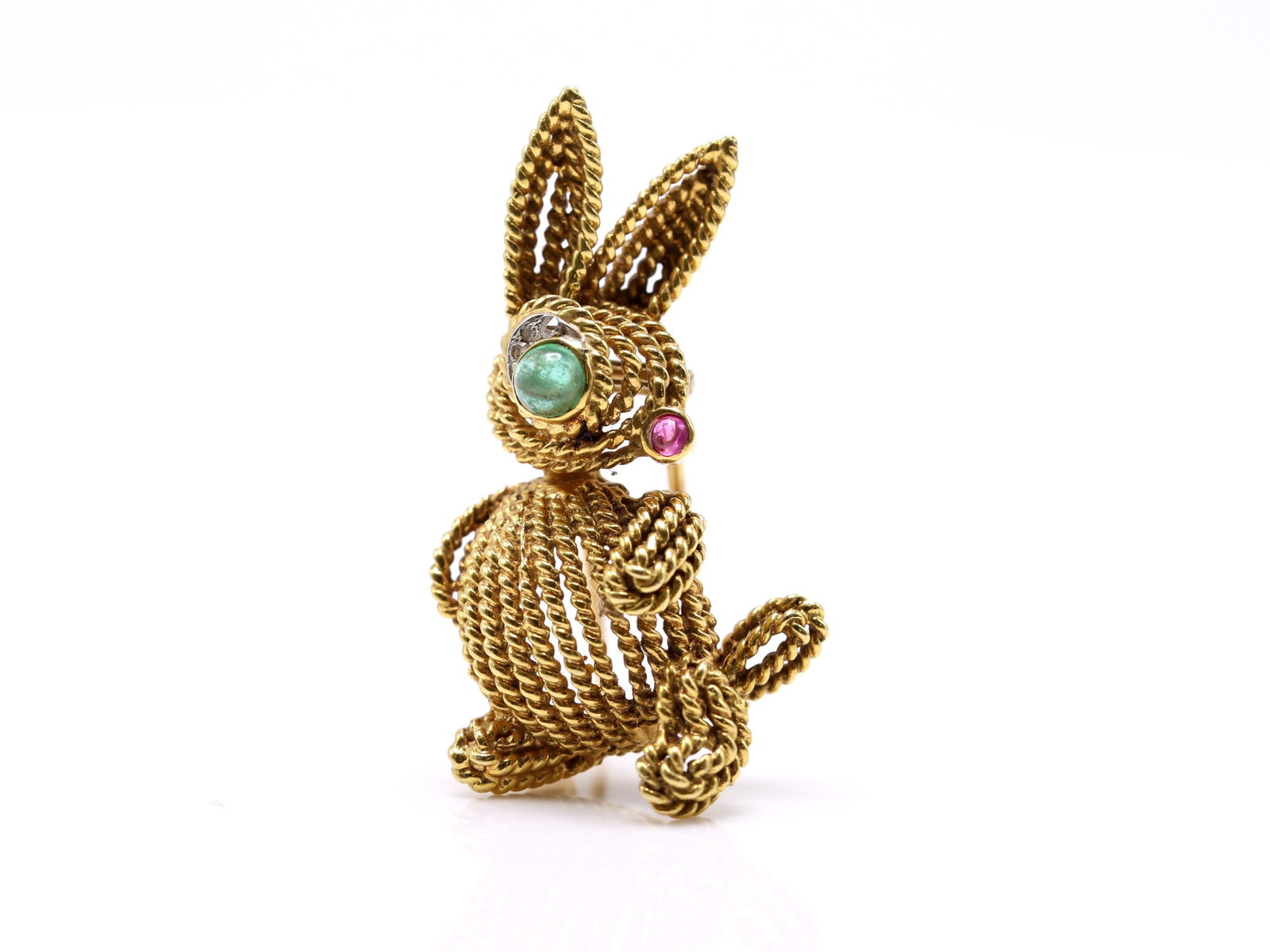 SoldVintage Van Cleef & Arpels 18k Yellow Gold Emerald, Diamond and Ruby Bunny Brooch PinMETAL: 18k Yellow Gold. GEMSTONES: Diamonds approx. 0.01 ctw, Emerald, Ruby. MEASUREMENTS: 43mm x 16mm. MARKED/TESTED: VCA, Made in France, 11/225 P, maker's marks/ tested as 18k Gold. WEIGHT: 11.See Sold Price