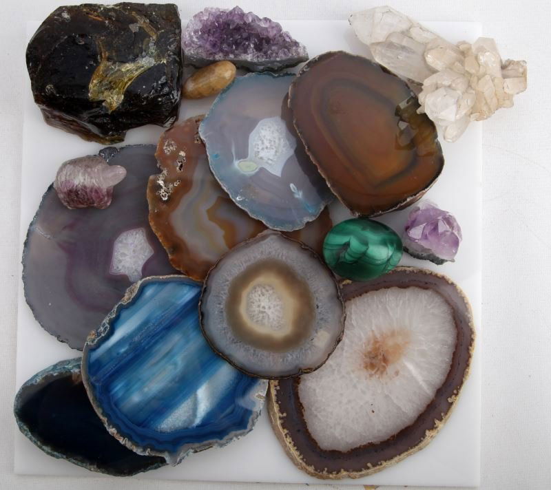 VARIOUS SLICED GEODES QUARTZ MALACHITE AND MORE